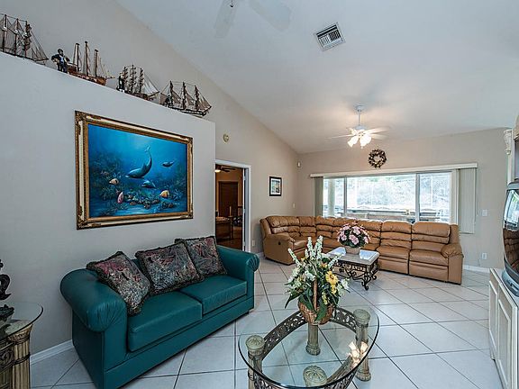 Lovely inland 3 bedroom and 2 bath pool home with a private fenced back yard. The home is ready for immediate occupancy or rental. Volume ceilings, large lanai with bar and lots of room for outdoor living and dining. Very large driveway with extra high garage. The home is centrally located and is close to dining, shopping, schools, library and just a short drive to the beach!