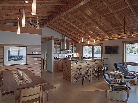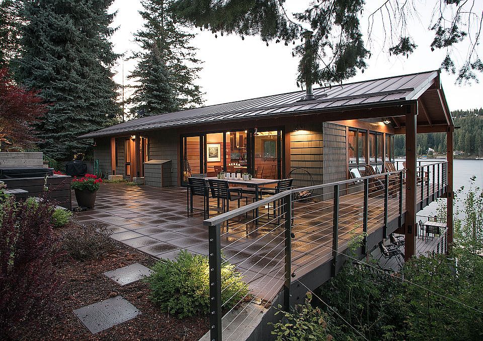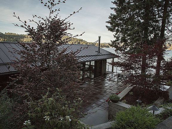 Lake CDA, Rockford Bay. Completely remodeled in 2013, 106' frontage, Sandy Beach 3 bdrm , 3 bath, 2210 sq ft. The style is ''Northwest Modern,'' warmed with extensive wood finishes and details that convey a cozy lake retreat. 2 car detached Garage, Large sliding doors open up to the landscaped patio and spa, greatly expanding the living space. There are no peek-a-boo views here, expansive views from all windows. Originally built in the early 70's Careful consideration was taken in the design to utilize the house as an easy transition to the water. . In-floor hydronic heat and air conditioning The house is sited just steps from the lake with a sand beach and concrete bulkhead, views will never be obstructed. Nothing like it on the lake!