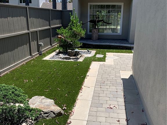 Home has A/C! Enter into the Front Courtyard w/New Brick Pavers, Eco-Friendly Artificial Grass. OPEN Floorplan with Dark WOOD FLOORING Throughout the Downstairs. Living Room w/Gas Fireplace & Crown Molding, Opens to Formal Dining Room for those Special Dinners. Kitchen w/White Cabinets, Pull Out Drawers, Pantry Cabinet also w/Pull Out Drawers, Granite Countertop, Newer Gas Range, Refrigerator, Recessed Lighting, Eating Area. Kitchen Opens to Family Room. There are Sliding Doors off of Both Dining Room & Family Room that Open to Private Back Patio also with Brick Pavers & Artificial Grass. LOW MAINTENANCE!! Downstairs Bedroom & Full Bath w/Tub & Shower Combo. Direct Access to Garage w/Washer & Dryer Hookups. LUXURY VINYL FLOORS UPSTAIRS and on the Stairs!! 3 Additional Very Large Bedroom Upstairs w/Cathedral Ceilings, Ceiling