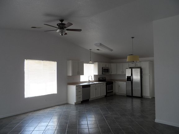 Wow! This one is sweet! The open floor plan, and vaulted ceilings makes this light and airy home a delight. There is a huge indoor laundry room with plenty of cabinets, and folding counter. There are tile floors throughout, and all is tastefully done. One of the prior owners was quite the handyman, and customized this for his wife's pleasure. The yard is fenced, with plenty of RV access and double gates. You are within walking distance of the elementary and middle school, but still have plenty of privacy as there are no neighbors on either side of you or behind you. You have unobstructed views of the desert, with no houses in front of you as well. If you are looking for a home with plenty of desert access, here you go. Hurry on this one.
