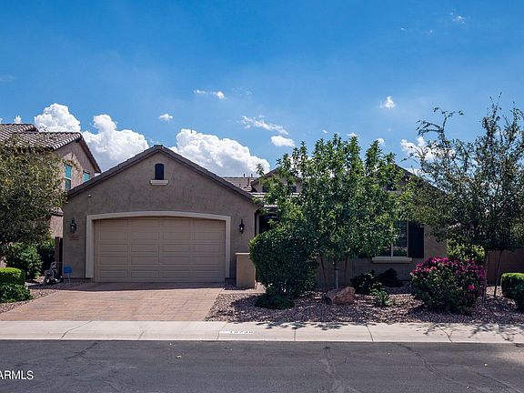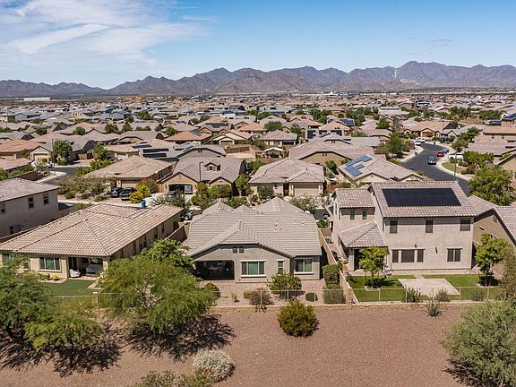 Welcome to your forever home! The first thing you'll note as you enter this amazing 4 bedroom, 3 full bathroom home, completed in 2017, is the tasteful upgrades that the original and only owner's Brad and Jenny picked out. As you walk into the home, you're gonna love the open concept floorplan that still offers up enough space to designate various spaces for living, entertaining, and dining. Along with this great floorplan and upgrades, is this home is one of only a select few homes in the community that does not back up to houses, block walls or streets. You'll love the the view from the living room, kitchen and primary bedroom as you gaze out to your tastefully landscaped backyard with views of the Estrella mountain range. You're going to love the spacious primary bedroom along with the primary bathroom featuring his and hers walk-in closets, separate dual vanity sinks, separate tub and shower, and private toilet room. The roomy additional bedroom are split on the other side of the house which also features a den/office space. The kitchen boasts Stainless appliances, including Refrigerator, a large kitchen island and a nice size eating area. Oh, and did I mention, custom tile throughout the home! The community on Blue Horizon features multiple parks for many types of sporting activities plus BBQs, and pathways for all types of exercises as well. The elementary/Jr high is just a short walk or bike ride within the community. You are also going to love that you're just a five minute drive to interstate 10.