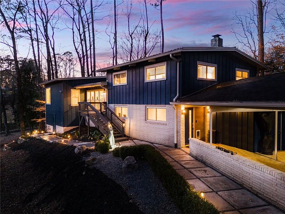 Step into this stunning mid-century modern retreat, perfectly nestled on a lush, private, end of cul de sac, over an acre lot with mature trees, scenic walking trails, outdoor lighting and a tranquil, meandering creek. Thoughtfully renovated from top to bottom, this architectural gem seamlessly blends classic MCM design with modern luxury for the ultimate in style and comfort. Inside, the expansive open concept living space is flooded with natural light from floor to ceiling windows, offering picturesque views of the serene landscape and glimpses of wildlife. The gourmet kitchen, recently redone, boasts high-end appliances, marble countertops and custom cabinetry. The primary suite on the main level is a spa-like haven with its own views from the corner windows of your own little slice of heaven. The luxurious en-suite bath comes complete with an oversized walk-in shower and hidden laundry cabinet and is just off the custom primary closet, which you have to see to believe. The perfect floorplan has additional bedrooms up a few steps on the other side of the house. One has been outfitted with a custom workspace, complete with a Murphy bed for your occasional guests! Two additional bathrooms on this level are both modern and luxurious.  Down a few stairs is an entire entertaining space with a room that could easily be closed off for an additional bedroom, with a full bath, laundry room and decorative corner modern fireplace. The enclosed carport has an EV charging stations and a generous storage room. The real star of the show, though, is the outdoor space. Off the kitchen, there is a screened porch with automatic raising and lowering screens, a couple of grilling decks - all spaces for you and your family and friends to gaze upon the breathtaking lap/waterfall pool.  You'll absolutely want to see this masterpiece in the evening with its lighting, its own pool deck, entertaining area and more. This heated gunnite in-ground pool awaits your parties, your floating, your laps, your relaxation and your enjoyment. Down a few flagstone steps is the firepit area.  Enjoy this space on cozy evenings under the stars or string your own screen/sheet up to host backyard film premieres when it warms up a bit. There are two perfectly situated trees already prepped for this:)  It's your own mini-amphitheater. Stroll down more steps to your acre-plus of land, already cleared for you with the remaining trunks fashioned into natural benches with outdoor lighting to enjoy this property and its babbling brook during all hours.  This magical property checks all the boxes inside and out for the discerning buyer who wants a piece of MCM history in the city.
