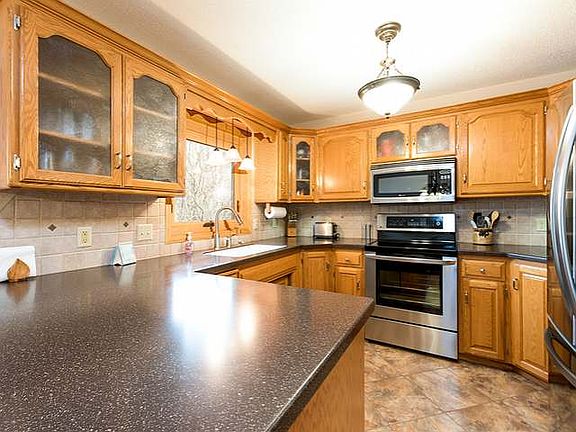 Pride of ownership shines in this ONE OWNER CUSTOM built home! A spacious foyer leads to upper and lower levels! The South facing living room features engineered wood flooring that flows into the dining room and kitchen! The updated kitchen offers oak cabinets, stainless steel appliances, tile backsplash, pantry, solid surface countertops and French doors leading to a bright & cheerful sunroom (2002). Just down the hall you will find the highly desirable main floor laundry, Master Bedroom suite w/ updated 3/4 bath w/tiled shower and walk in closet! There is an additional bedroom and full bath on this level. The lower level family room is generously sized w/ gas fireplace, dry bar for entertaining and daylight windows! Another bedroom and large office/den room that could accommodate another bedroom and 3/4 bathroom. Outside boasts sprinklers, rocked fire pit on the patio, lilac bushes, and garden spot! New shingles 2014 Windows 2015 water heater 2013 furnace 2002.