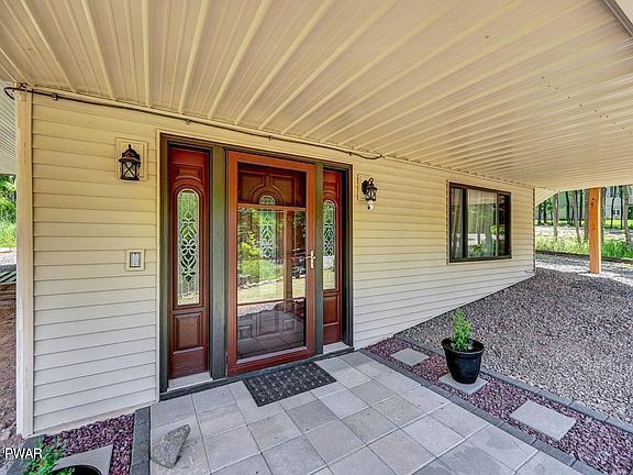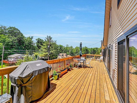 Located in The Hideout, a four-season amenity filled community in The Northern Poconos. Welcome to your new chalet home on Lakeview Drive E! Nestled perfectly between North Beach, Roamingwood Park, and the marina, this stunning property offers the ideal blend of convenience and tranquility. This beautiful chalet features a circular driveway and a carport, providing ample parking. With three finished levels, the home boasts a recently added three-season room, perfect for enjoying the scenic surroundings year-round. The front deck, accessible from both the sunroom and the living room, offers a lovely spot to relax and entertain. Inside, the main level is adorned with laminate flooring and a free-standing propane fireplace, ensuring cozy warmth. The second level features two bedrooms with vaulted ceilings and generous storage space. The finished lower level includes a spacious recreation room, an additional room suitable as an office or a fourth sleeping area, a newly renovated bathroom, and a laundry room.This charming home comes fully furnished, ready for you to move in and enjoy. Don't miss out on this rare opportunity to own a piece of paradise in a prime location!