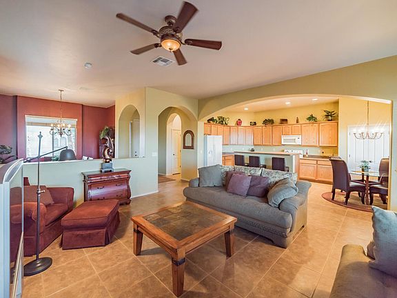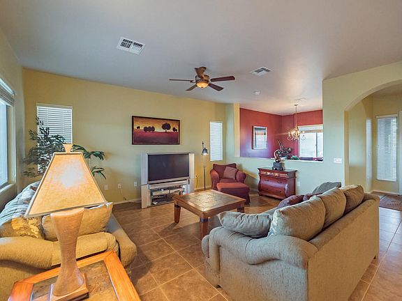 A beautiful home sitting high on a hill overlooking the Canoa Ranch Golf Course where you can also appreciate views of the Tucson Mountains miles away to the north. Two gorgeous palms trees sit next to a small paver patio that affords you outstanding views of the Santa Rita Mountain also! When you walk into the great room you will notice the desert toned floor tile, wide open floor plan and arched gateway passages. You will also find a cook's delight kitchen with an abundance of cabinets and countertops, double door pantry plus a convenient breakfast nook. The open area adjacent to the great room can be used for either a formal dining room or an office/den area. Your master suite is spacious and the bath features separate his and hers vanities and built-in makeup station.