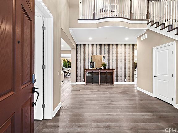 Masterfully built by Toll Brothers, this extraordinary modern-style home in Yorba Linda is full of excellent features. Luxurious upgrades are found throughout the entirety of the home. Windows and glass sliding doors seamlessly compliment the indoor/outdoor flow. The main level boasts a grand foyer that is illuminated by a contemporary style chandelier. Formal living room perfectly transitions into the dining area. The gourmet kitchen holds elegant cabinetry and vast center island. Adjacent to the kitchen is the family room which is outfitted with a gorgeous stone style wall and features sliding glass pocket doors that lead into the outdoor living. The outdoor area boasts a swimming pool and spa as well as an open area that is perfect for entertainment. Also on the main level is a home office as well as downstairs bedroom for added convenience. Residing on the upper level is the astounding master suite which holds a seating area, luxurious bathroom, and walk in closet. Completing the upper level are the remaining generous bedrooms and loft. Additional highlights include laundry room, three car garage, paid off solar, and many more. This estate allows for the comfortable lifestyle of Orange County, all while boasting dazzling aesthetics.