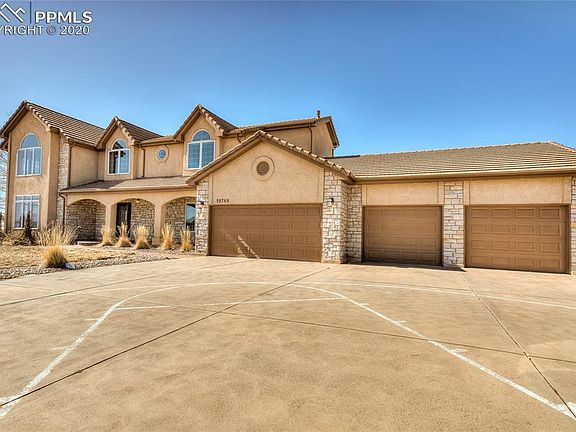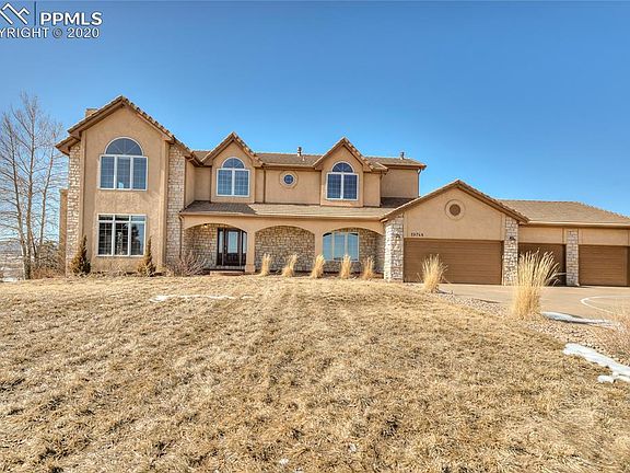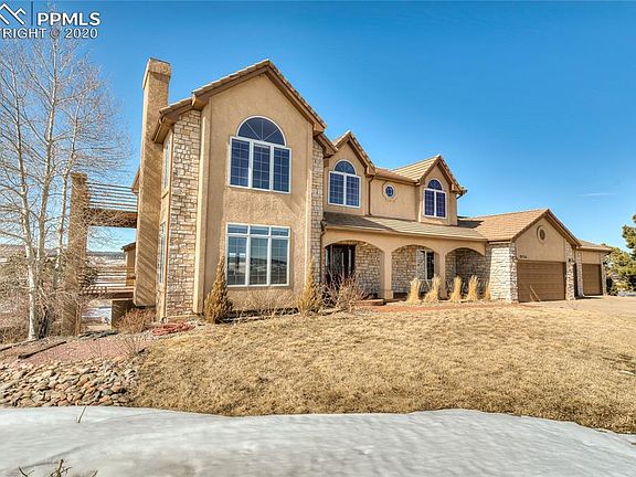 Stunning stucco and stone two story home situated on 2.52 acres in Kings Deer and has breathtaking views of Pikes Peak and the Front Range. This updated custom home features new carpet throughout, a dramatic two story foyer with curved stairway w/ new railings, arched doorway leading into the living area with gas fireplace and crown molding, large formal dining with crown molding perfect for large family gatherings. The cheerful gourmet kitchen boast brand new slab granite counters, new back splash, ss appliances, veggie sink and gas range top in huge center island w/ breakfast bar to enjoy company while cooking, Cherry cabinets, Pantry, planning desk, hardwood floors and bayed breakfast nook. Spacious great room off the kitchen area with stacked stone fireplace and gleaming hardwood floors walks out to a beautiful deck to enjoy the Colorado evenings. Notice the thoughtfully placed Pella windows throughout the house that perfectly frame the Front Range and Pikes Peak views. Upstairs features a vaulted master suite w/ sitting area, gas fireplace, walk-out to private deck, large walk-in closet, adjoining 5 piece master spa, jetted tub and glass block shower w/ dual shower heads, three additional secondary bedrooms & 2 full baths complete the upper level. Walk-out lower level w/ family room w/ stacked stone fireplace, rec room, large office or 5th bedroom and bath. Convenient main level mud room, laundry w/ utility sink, central vac, intercom system, security system, pre-plumbed for a/c, beautifully updated and move-in ready. Colorado living at its finest!