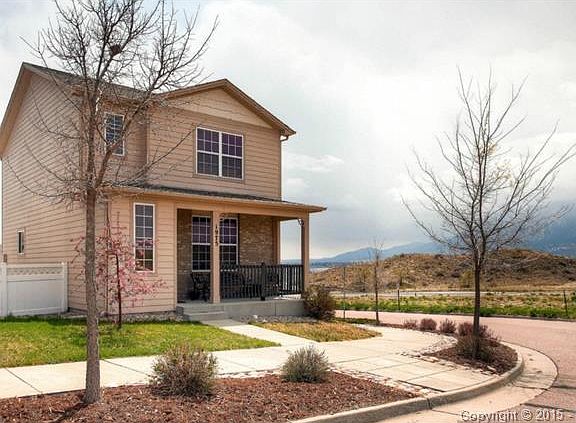 Contemporary 2 story home, fully landscaped in great community. Front porch welcomes you to sit & enjoy the view! Walk into this bright floor plan, with spectacular mountain views! Master bedroom with adjoining bath and large walk-in closet located on upper level with additional 2 bedrooms and full bath. Family room, 4th bedroom and full bath complete the basement. Open living room with 9ft ceilings, and large front window provides ample natural lighting. Continue to spacious kitchen with stainless steel appliances, island, including breakfast bar, pantry and eat in country dining. Guests can access 1/2 bath on main level. Just off kitchen, is laundry room & steps to backyard. Stone patio will suit your summer entertaining, perfect for grilling out! 2 car detached garage, accessible by the paved alley behind home gives an urban feel to Colorado living. HOA includes snow removal, trash, common utilities and management. Location provides easy access to military bases & schools, hurry this home won't last long!
