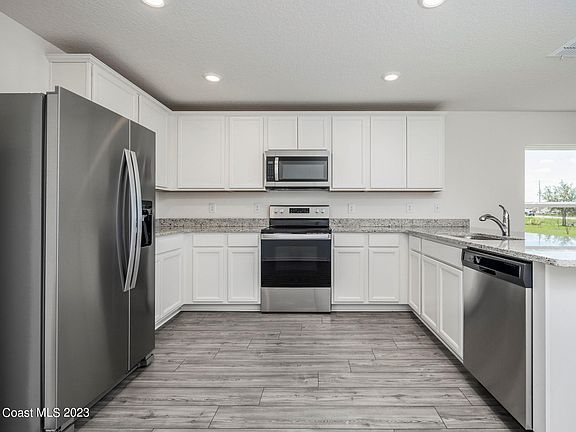 bathrooms and is complete with over $10,000 in upgrades. These include energy-efficient Whirlpool® appliances, spacious granite countertops in the kitchen, stunning wood cabinets, brushed nickel hardware and an attached two-car garage. In addition, the Estero's secluded master retreat highlights a large walk-in closet. Best of all, Palm Bay offers residents a premier location with convenient access to nearby golf courses, world-class area beaches and amenity-packed parks. **appliance models are subject to availability**