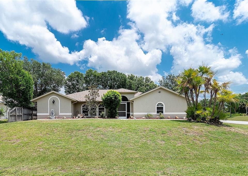 Accepting Back-up offers. Perfect opportunity to own this beautifully maintained 3-bedroom 2-bathroom pool home with attached 2-car garage located in North Port. Home has 2,238 square feet of living space and sits on a corner lot with a size-able fenced in backyard. This open/split floor plan home with cathedral ceilings has perfect spaces for all, including family room, dining room, living room and Florida room all connected to the beautiful outdoor area that make this perfect for living out your Florida dream lifestyle. The kitchen features newer stainless steel appliances, breakfast bar, dinette area, pantry closet, granite counter top with matching back-splash, lots of cabinet space and is open to your Family room. The living/dining rooms have beautiful wood laminate flooring and pocket sliders out to the Florida room. The Master bedroom has two walk-in closet and access to the Florida room/pool. Master bathroom with large walk-in shower, soaking tub and vanity with his/her sink area. The guest area has 2 bedrooms, with wood laminate flooring, offer plenty of room for vising family and friends. One has with access to the pool area. Guests have access to their own full bathroom. Entertain family friends in the huge Florida room with a/c, that opens up to your screened in pool area with new stone stamped decking that was added in 2017, outside shower and extra patio space. Home also features 8x12 wood shed with electric and workbench, roof updated in 2018, septic in 2020, laundry room with utility sink, new fence in 2018. Located in young and growing North Port, Florida-one of the popular places to live! Close to sandy beaches, famous Warm Mineral Springs, Entertainment, Shopping/Restaurants, I75/US41 and lots more!