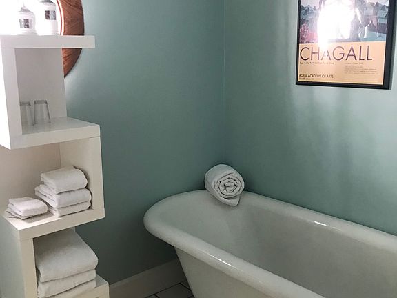 2nd floor large room on side of house with partial view of river, large closet, hardwood floor, king sized bed, wireless internet, basic cable and roku on TV. Room has a private attached bathroom with a vintage soaking tub and seperate shower unit. Main floor has shared living spaces, lounge and possible kitchen access, front porch with seating that overlooks the river. The home is located next to a railroad track. Owner pays all utilities. Housekeeping is offered twice per month. No overnight guests without permission.