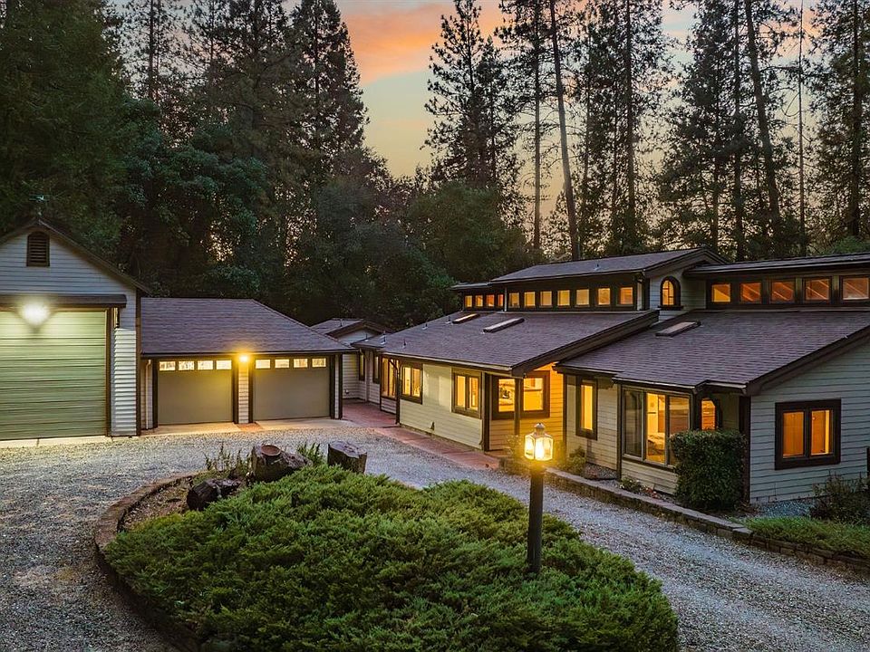 Experience ultimate privacy and tranquility in this secluded home, nestled on 7 lush acres. Accessed through a gated entrance, this serene retreat offers a peaceful escape from the outside world. The main living area is thoughtfully designed with vaulted beamed ceilings, expansive windows that frame views of the surroundings with a woodstove and open to the formal dining area. The kitchen has great storage space featuring two pantry closets and a breakfast nook. An attached in-law unit offers flexibility for extended family or guests. Enjoy warm summer evenings on the screened-in back porch, a perfect spot for relaxing or enjoying company. The property includes both an RV garage and a detached 2-car garage. Despite its seclusion, this home remains conveniently close to amenities, providing privacy and accessibility. Experience the best of both worlds in this unique and captivating property.