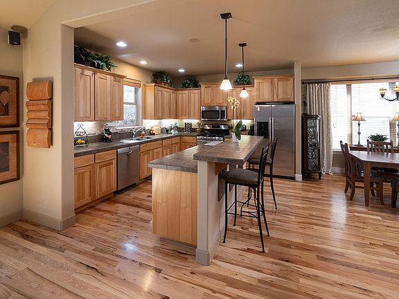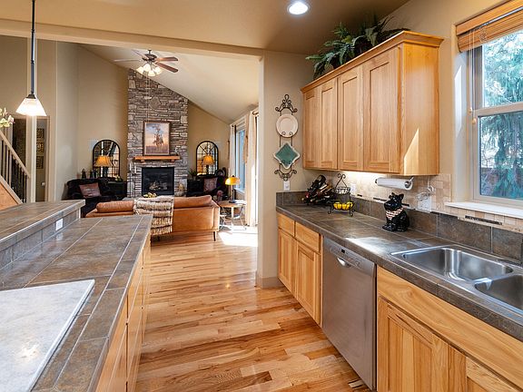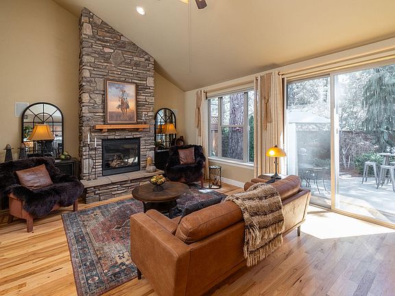 Enjoy this beautiful home with 3 bedrooms plus office with built in cabinets & French doors. This home has nice interior finishes such as hickory hardwood floors, gas fireplace with floor-to-ceiling stone hearth in the great room, 8 ft doors on lower level, ceiling fans, air conditioning, & surround sound. Large kitchen has island with breakfast bar, lots of cabinets, pantry, stainless steel appliances including newer dishwasher, and large dining room great for entertaining! Spacious primary bedroom has walk-in closet & bathroom with double vanity. Third bedroom has new paint & flooring; works well as an art or craft room. Relax on the back patio with hot tub while enjoying the gorgeous landscaping & privacy in your own backyard! This property does not directly back a home. Outdoor shed has tandem doors & storage in the garage! Access Deschutes River Trail and park in the neighborhood! Located close to the popular Pine Ridge Elementary, few minutes to Old Mill and Downtown.
