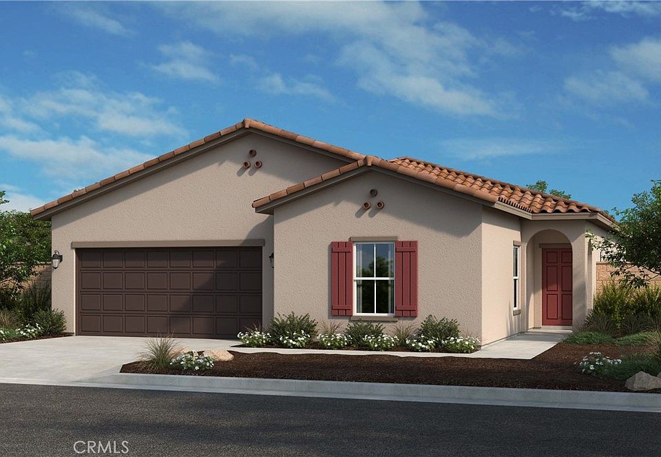 Beautiful Spanish-style, single story home in the breathtaking community of Spring Mountain Ranch. 4 bedrooms, 2 bath home with generous great room is perfect for entertaining, and family gatherings. Large kitchen island, granite countertops, energy-star appliances make this home the perfect fit. Located walking distance from 6 acre community park, and multiple hiking trails. Photo is a rendering of the model. Buyer can either lease or purchase the Solar.