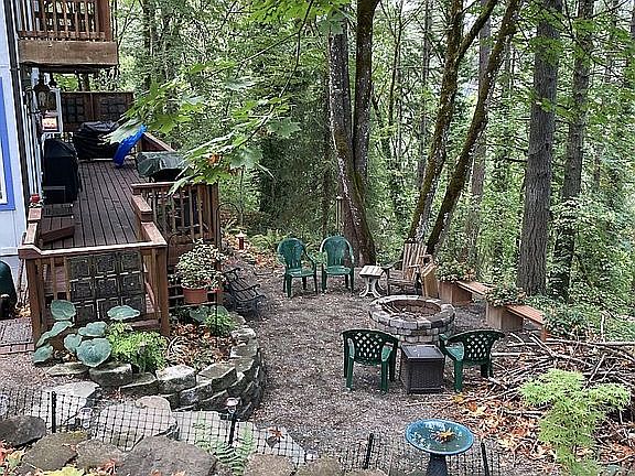 A lovely private setting for this updated unique home. Enjoy the privacy out your deck for early morning coffee and a quiet dinner at night. A calm and peaceful setting with many updates throughout. Including the roof in 2017 (replaced rear roof in 2021), the furnace 3 years old, garage 5 years old (with new metal roof in 2023) and new retaining wall and backyard entertaining space with fire pit, new plumbing fixtures, kitchen counter tops, flooring, appliances , new sheet rock and interior paint. Great fireplace in living room for those cooler winter evenings. Sloped stamped concrete entryway and front porch, with appropriate drainage to direct runoff away from the house, added in 2022.