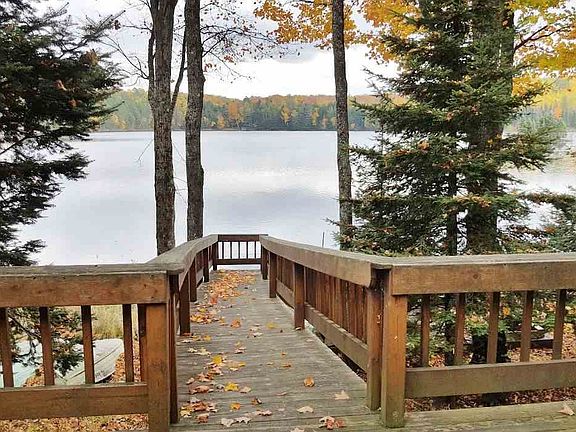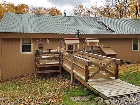 What a perfect setting with wonderful views from this custom built home on County Line Lake. Quiet peaceful setting on the end of Gus Lane to enjoy 250 feet of level frontage on a 67 acre lake within thousands of acres of State Land. When you enter this home you will find an UP NORTH ambiance within the open concept great room, Pine cathedral ceiling with log beams and tongue and groove Pine walls. Very spacious home with a full walkout basement on the lake side. This property offers a large yard with deck and wooden walkway to the lake. You will enjoy the private, quiet area where other owners of homes are seasonal. This home has 200 amp electric, propane forced air furnace and central air, free standing wood fireplace in the great room. There is a point well with a mound system septic, wood siding and metal roof. Also, an additional storage shed for storage of your outdoor items. This home was built in 2000 and has 1,680 square feet of finished living area. The county maintains the road from Hwy. 45 to this home which is on the end of Gus Lane. The Sellers are very anxious to offer this home to buyers who want to enjoy a peaceful lifestyle with all of the wildlife that is abundant in this area on their 2.6 acres of land.