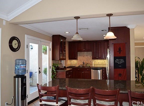 Gorgeous Home in South Huntington Beach, close to the water!!Upgrades include, cathedral ceilings, custom Fireplace, crown molding throughout, tumbled marble flooring and recessed lighting. HUGE LIVING ROOM with wall to wall french doors that looks out to a tropical paradise Remodeled kitchen with cherry wood cabinets, stainless steel appliances, granite counters and so much more Large Master Suite, includes hardwood flooring, french doors, custom archway, crown molding, shutters and a ceiling fan. The master bathroom features include granite counters, dual sinks, custom wood cabinets, huge stone spa like tub, stone shower and custom lighting. Spacious second bedroom upgrades: hardwood floors, french doors, crown molding, wainscoting, custom shutters, ceiling fan and recessed lighting. Third Bedroom upgrades: hardwood flooring, ceiling fan, crown molding, and custom shutters. Beautiful hall bathroom has been remodeled with everything This is a tropical paradise, close to top rated schools, shopping, and of course the beach, downtown Huntington Beach, Pacific City and of course it is in Surf City