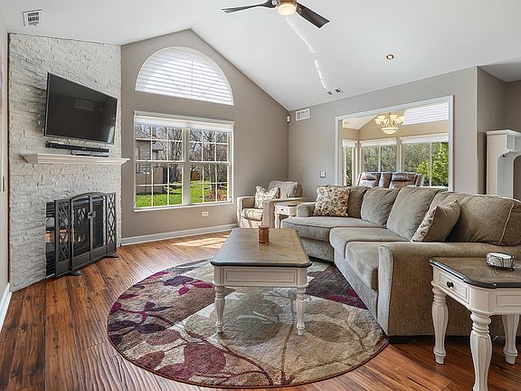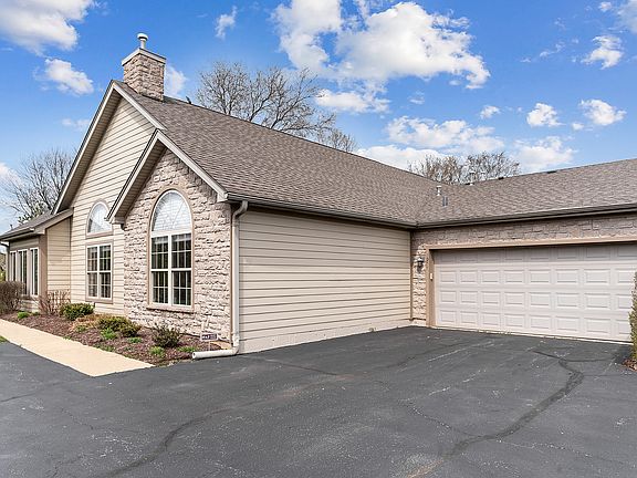 This tastefully updated ranch townhome offers a maintenance-free exterior of stone and Hardiboard siding with an open floorplan in a private setting. Soft, natural light fills the home through cordless light-filtering shades. Enjoy your time in the Kitchen featuring a vaulted ceiling, all stainless steel appliances, Corian counters with an integrated sink, breakfast bar, ceramic tile backsplash, recessed and pendant lights, porcelain tile flooring, and planning desk. The Kitchen also boasts abundant white cabinetry with crown molding, under-cabinet lighting, soft-close drawers and doors, and pull out shelves in many cabinets. The dining area offers an updated light fixture with hand-scraped engineered hardwood flooring which flows through the rest of the home. The Living Room features a cathedral ceiling; dimmable recessed lighting; and a gas log fireplace with a white, floor-to-ceiling textured marble surround. The TV and sound bar mounted above the mantel stay, as well. The Primary Suite also has a cathedral ceiling with lighted ceiling fan, and a pocket door to the private bathroom. This bathroom features a walk-in closet with carpet; linen closet; a long Corian countertop vanity with dual integrated sinks and soft-close doors and drawers; porcelain tile flooring; and a water closet with a step-in shower that has grab bars, hand-held shower head, and built-in seat. The 2nd bedroom has a cathedral ceiling with lighted fan, and a wall closet with a organizer. The Office/guest bedroom has a cathedral ceiling with lighted fan and glass French doors. The 2nd bathroom is detailed with porcelain tile flooring; a tub/shower combo with a recessed light and hand-held shower head; Corian countertop vanity with an integrated sink, and soft-close doors and drawers; plus a linen closet. Adjacent to the Living Room, added living space can be found in the 4-season Sunroom, surrounded by 7 windows. The Laundry room is conveniently located through a pocket door from the Kitchen and offers a full-size washer and dryer, coat closet, additional cabinets, and porcelain tile flooring. This leads to the 2-car garage with an epoxy-coated floor, added cabinets for storage, water spigot, and pull-down stairs to the attic. Enjoy relaxation on your concrete patio or head over to the 3000 s.f. Clubhouse with it's exercise room and outdoor pool. Newer roof (2021), water heater (2020), 5-burner stove with griddle (2020) and built-in microwave (2020). Plainfield schools. Exceptional home, beautiful setting.