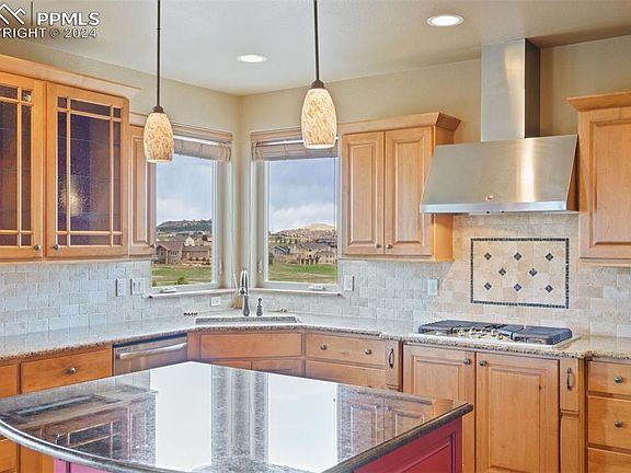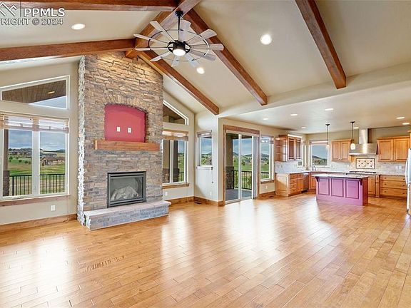 Quintessentially Colorado, this gorgeous custom retreat reflects excellence inside and out. The Kings Deer Highland subdivision is aptly named for the rolling, highland views of Pikes Peak and the Front Range Views, just 25 minutes from both Colorado Springs and Castle Rock. The generous and spacious ranch floor plan greets visitors with a welcoming front porch and a dramatic vaulted entrance, highlighted with rustic beams and arches. Wide-plank hardwood floors throughout the main level add a deep richness to the space. The kitchen offers interior-lit custom maple cabinets with accenting island and slab granite, complimented by GE Profile stainless appliances, a gas cooktop, and a walk-through pantry. The everyday comfort continues to the kitchen gathering space, and seamlessly expands to the living room floor-to-ceiling fireplace. Sliding doors open to the covered composite deck with a view of Pikes Peak. The formal dining room is enhanced with custom features such as a 10' tray ceiling, crown molding and ambient lighting. The primary suite is private, with vaulted ceilings, a double-sided fireplace, and an opulent bath with a luxurious soaking tub, spacious closet, and a showstopping, frame-less glass shower with rain head, granite bench and elegant tile inlay. The bedroom configuration on the main level includes an office/bedroom across from the bath as well as a more private bedroom en suite. Completing the main floor is a 3/4 bath, a walk-through pantry, and highly-functional laundry room with windows and an extra deep sink. Quality continues in the basement with alder trim and doors throughout, and a signature wet bar with stone, granite slab, two sides of abundant cabinetry, wine rack storage and fridge. Two garden level bedrooms enjoy a 3/4 bath with granite slab, alder cabinets and deco tile. Hot tub, end of cul-de-sac, on the golf course, and offered with Additional Water Rights.