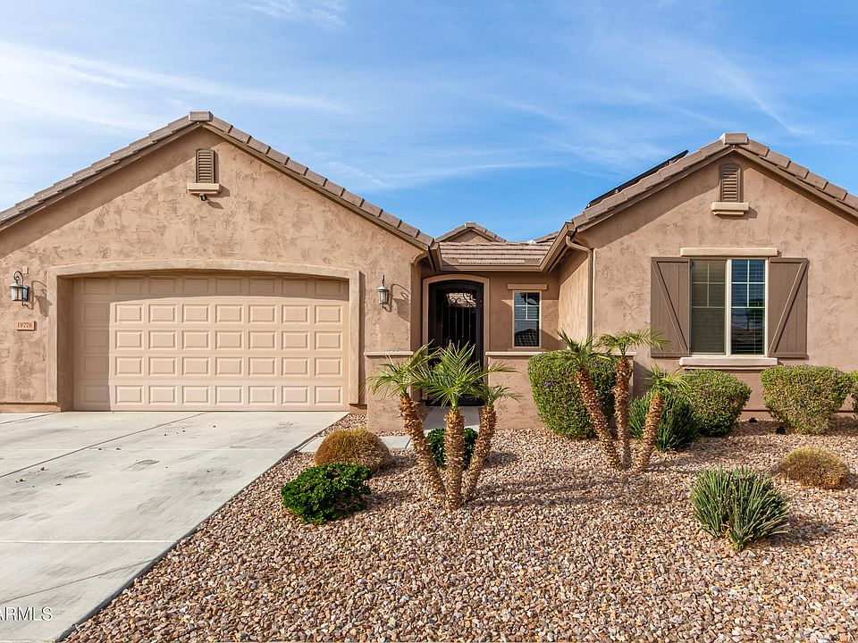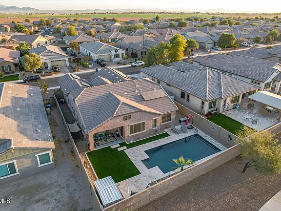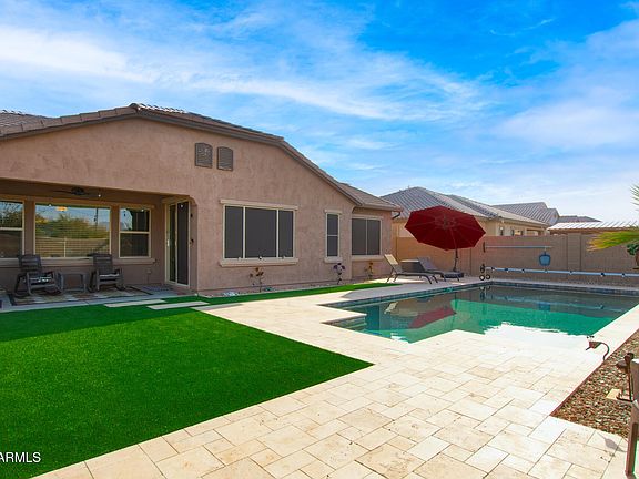 Welcome to this stunning single level 4-bedroom, 3-full bathroom home featuring a unique split floor plan and a versatile flex room. The gourmet kitchen boasting granite countertops, a double oven, and ample cabinet space. The backyard is an entertainer's paradise with artificial grass and a Pebble Tec POOL, perfect for cooling off during the hot Arizona summers. Enjoy the ultimate privacy with no neighbors behind. Additional features include a double side gate with an extra slab for additional parking, a three-car tandem garage, and an OWNED solar system for energy efficiency. Located in the desirable Blue Horizons community, residents enjoy amenities such as playgrounds and walking paths. The home offers convenient access to I-10, shopping centers, dining options, and Costco