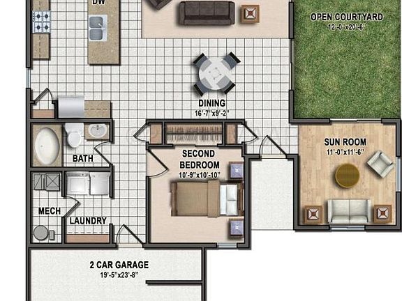 The ''Williamsburg'' floorplan is well-designed one-level living, outside & in! Smart details start in the kitchen: TWO pantries, pots&pans drawers, raised dishwasher (a major back-saver!), kitchen window, quartz countertops, tile backsplash and under-and-above cabinet lighting- a chef's dream! The dining & living rooms feel so open and light and connect with vaulted ceilings, beautiful hard surface flooring and an abundance of windows. Two bedrooms and two baths, including a large primary suite with private bath & WIC, plus a sunroom- great as a TV room, den or office. Outside a covered patio AND wind-protected courtyard help you enjoy the best of all seasons. Lawn & Snow Ass'n $135/mo. Tankless water heater, 10yr structural warranty & 2yr tax abatement! Use as model, this home is SOLD.