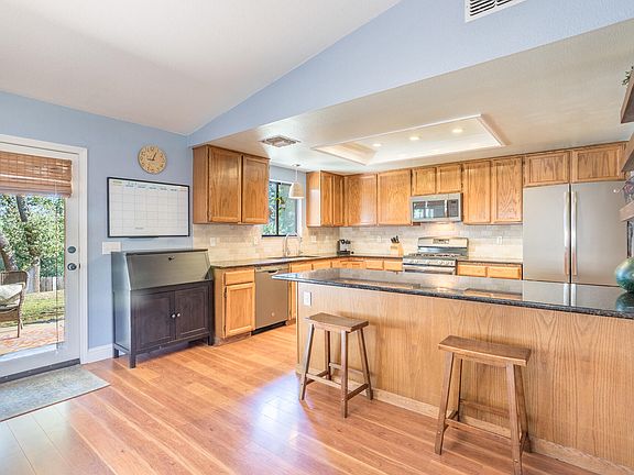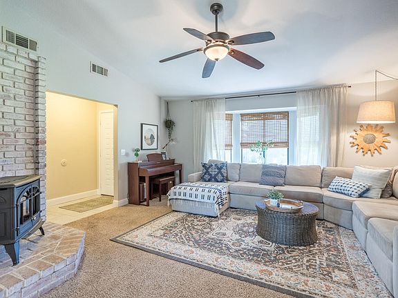 Welcome to this dream home nestled at the end of a tranquil cul de sac! This charming property offers the perfect balance of comfort and style. Step inside and be captivated by the inviting open floor plan with elegant vaulted ceilings, creating a sense of spaciousness and relaxation. The living room boasts a cozy gas stove, providing both warmth and ambiance. The modern kitchen is equipped with sleek stainless appliances and a convenient breakfast bar for casual dining or entertaining guests. 3 comfortable and accommodating bedrooms! Plenty of room for parking with the attached garage and spacious side yard that can fit an RV! The large back yard includes a covered back patio and a storage shed that all backs up to a greenbelt!