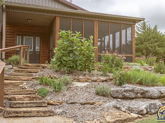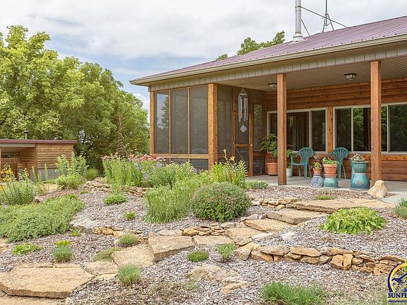 Who wants to live the self-sustained lifestyle and grow their own food? Located in the coveted Buck Creek Valley NW of Lawrence sits this private 30-acre retreat, with the house 1/4 mile off the road with no visible neighbors! Built in 2006, this 1906 sq ft 4 bed/3 bath ranch offers energy-efficient living with 2x6 walls, stained concrete floors, and 3 heat sources: propane furnace, radiant wood stove, and in-floor heat. Central air, attic fan, and EV-ready electric with 2 panel. Updated Pro Via windows, climate root cellar/storm shelter, and screened-in porch. Powered by two solar arrays with generator hookup. Includes LG and Bosch appliances, 500-gal owned propane tank, and wood fired 10-person sauna. Extensive organic garden beds, fruit trees, berries, asparagus, and more. Rainwater tanks, low-maintenance Buffalo Grass, and incredible privacy. Truly one-of-a kind sustainable homestead!