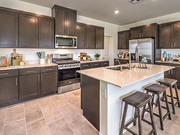 - Description: Breakfast Bar/Counter,Breakfast Nook/Eating Area,Island,Lighting Recessed,Pantry,Quartz Countertops,Solid Surface Countertops,Stainless Steel Appliances,Tile Flooring,Walk-in Pantry