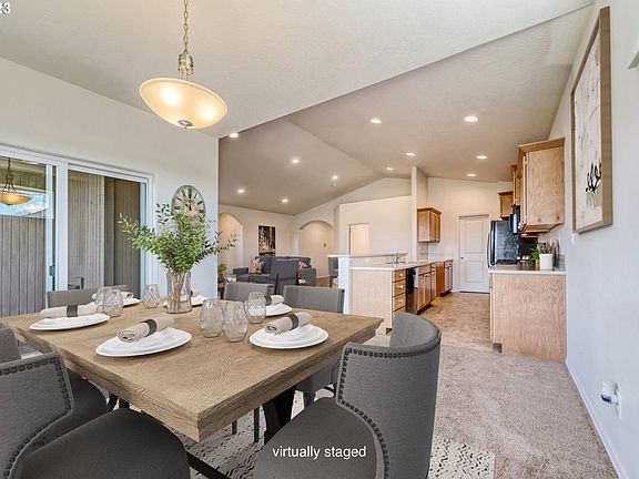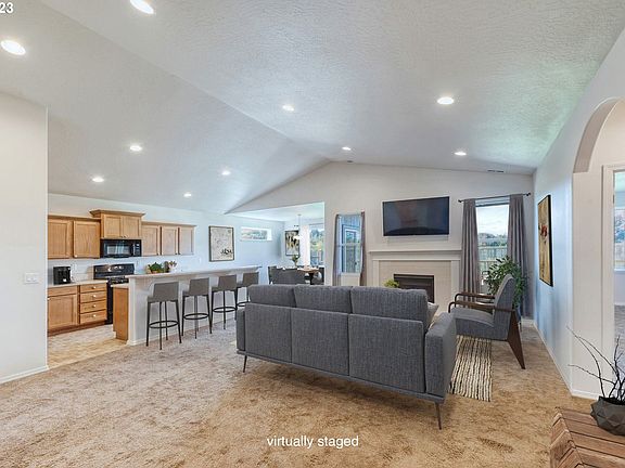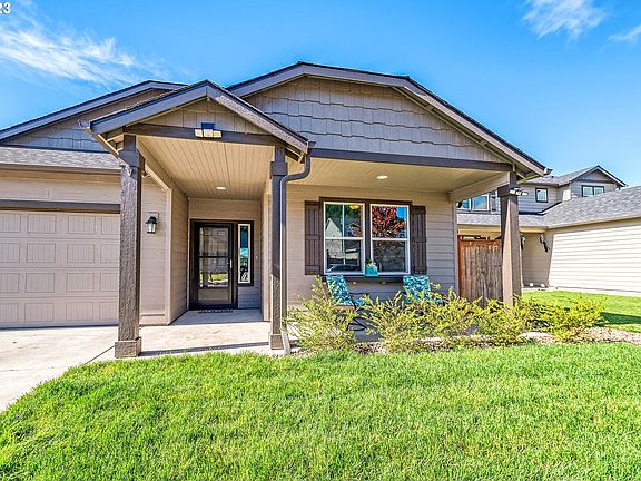 New beginnings start at this clean and bright one-level home with attached 3-car garage in an upbeat Thurston neighborhood. Imagine yourself enjoying the expansive big westerly sky view from the living area with complete privacy or tucking-in in front of the cozy feature wall gas fireplace on a chilly night. Open-concept kitchen with bar/island and walk-in pantry ensures no one gets left out. Quick access through a sliding glass door takes you to the covered patio for entertaining and endless playtime on the level and lush grassy fully fenced backyard. You choose: Just 15 minutes from I-5, hospitals, and major shopping/entertainment. Or head east to four-seasons of world-class outdoor adventure and recreation along the pristine Makenzie River and Willamette National Forest. Nearby Quartz Park offers an open play field with a perimeter walking path and amazing play equipment all right around the corner. At the end of the day, relax in the oversized main bedroom featuring a spa-like ensuite with soaker tub, walk-in shower, dual vanities, walk-in closet, and water closet. Oversized 2nd and 3rd bedrooms share a hall bath with tub. A generous inside laundry room completes this move-in-ready home. No HOA dues and all the newer appliances included with sale. Plus, Seller offering up to $5K towards your closing costs! Don't miss out - call your agent today for a showing!