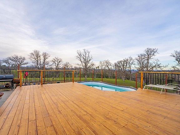 This 3 bedroom, 2 bath home welcomes you to your own private oasis on 3/4 of an acre located at the very end of the cul de sac. The bedrooms are a generous size with lots of natural light. The Master bedroom suite is spacious and the slider leads to a private deck with views. The master bathroom includes a soaking tub, double sinks, large shower, and is finished off with a very large walk in closet. The living room, dining room, and kitchen space are open and airy. The pellet stove keeps the home warm and cozy for fall and winter evenings. The garage has a large work bench and tons of storage to meet all of your needs. Lots of new additions to this home including all new vinyl plank flooring and baseboards throughout, gas range/oven, deck, iron fencing, above ground pool, retaining wall, oversized shed, and a brand new pergola finished Mid May 2025. The pergola is crafted of wood, metal roof, and finished off with black hardware. The deck is flush with the pool so you can slip right in for a dip. The sand filter and vacuum keep the pool sparkling clean. The backyard feels private with no neighbors in sight. There are rolling hills with glorious sunsets, it is a peaceful retreat for all.This gated community has a variety of amenities including the Lake Club, Lounge, Campground, Equestrian Center, Airport, Recreation amenities, and Sacramento River access.