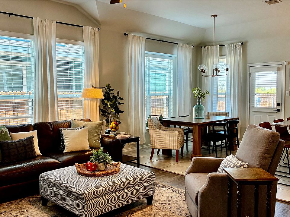 This home shows like a new model.  Fun and pretty front porch with porch swing led to a big wide entry way. This jewel box home has so many features like special wood wall treatments and accent colors.  Huge living area with open concept.  All rooms have solid surfaces.  Window coverings and wood blinds.  Granite counter tops in the kitchen offer sleek gray tones. So much light fills all the rooms. Stainless appliances and yes, a gas stove for the chef in the family. Big breakfast and kitchen bar is perfect for buffets with friends.  Breakfast room sports a pottery barn flair. Cozy backyard with covered patio set up for tv to enjoy on game day.  Places for BBQ equipment and room for kids and pets.  Garage is in the rear for uncluttered look. Behind home is a farmer's field with offers a meadow of sweet smells to enjoy country living but in City.  The community is Disney for kids.  Clubhouse weight room and pool and playgrounds.  Parks and schools down the street.  This is not just a regular home.  This home is loaded with extras and has been loved.