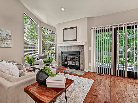 Highly coveted waterfront River Run Condo situated along the Boise River and surrounded by lush, mature landscaping, abundant wildlife, meandering streams, ponds, meadows & a 6-acre Lake Heron. This is truly a one of a kind community & property. Desirable end unit illuminated with natural light, vaulted ceilings, hardwood flooring, & a cozy gas fireplace. Beautiful custom open tread wood staircase & wood beam, upstairs loft could be 2nd bedroom, office, or bonus room. Kitchen features SS appliances with gas range, quartz counters, & custom cabinetry. Spacious main floor primary with custom travertine bathroom/shower. Unwind on your patio overlooking the stream or utilize the miles of paths throughout the community or to the Greenbelt. Easy walking/biking access straight to Downtown! HOA covers exterior maintenance, roof, landscaping & snow removal.