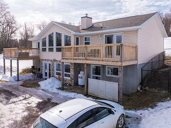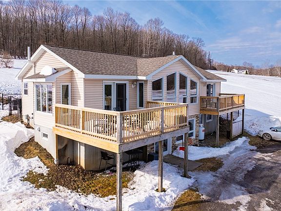 Sitting privately on 2.74 acres as the centerpiece of a picturesque backdrop awaits the beautiful 1979 State Route 28, arriving on the market in search of its next homeowners! The 1,359 SqFt raised-ranch provides a fully turnkey interior, paired with an exterior offering limitless potential. As you enter the driveway, trees bordering the lot highlight the beauty of Upstate New York’s four seasons while serving as the frame to a beautiful setting. Whether you’re utilizing the acreage for summer recreation or watching the snowfall as the fireplace roars, the property proves to be a true year-round haven. With an open-concept main floor, the cozy living room flows into the dining space while the contemporary kitchen sits adjacent. The kitchen boasts meticulously crafted cabinets & countertops as well as an eat-in island. The allowance of natural light throughout the interior provides an enhanced glow to the home’s woodwork & embellishments while stylish light fixtures illuminate the home at night. Along with the main rooms, the home provides 4 spacious bedrooms & 2 full bathrooms - including a main suite with a private bathroom! A designated laundry area offers the convenience of main-floor laundry. The renovated basement offers an additional common area suitable for recreation, storage, or office space. Enjoy outdoor relaxation on the 2 balconies while an abundance of backyard space creates endless recreation possibilities. A 2-stall detached garage is included on the lot offering the household parking convenience. This move-in ready property is ready to welcome its next owners & provide them with an immediate sense of ‘home’. To schedule a tour of this home or for more property information, get in touch with a member of our team today!