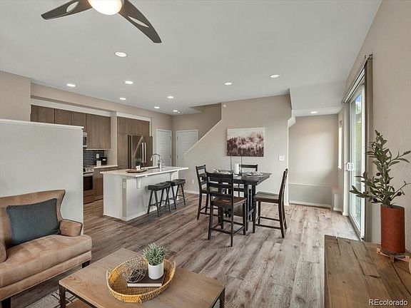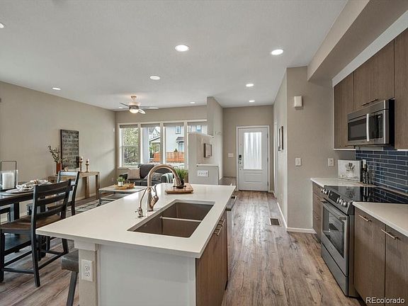 A corner lot with mountain views just one block from the park in Denver’s highly coveted Midtown neighborhood. This peaceful, private home has no shared walls and faces south for beautiful morning sunlight across its open floor plan. A covered front porch welcomes you into the home, where you’ll find a pristine primary living space with plenty of room for cooking, dining, and relaxation. The kitchen features stainless steel appliances, quartz countertops, custom cabinetry, and a large island. Head down to the fully finished basement or go upstairs to enjoy 3 spacious bedrooms, 3.5 bathrooms, and a soaring loft space with a walk-out balcony where you can take in the Rocky Mountain view. The master suite includes vaulted ceilings, a spacious bathroom, and a walk-in closet. There are updated window coverings and custom cabinetry throughout, EcoBee thermostat, bustom built-in bookshelves in the loft, modern bathroom light fixtures throughout and an attached 2-car garage with built-in storage. Midtown sits conveniently in northwest Denver just 10 minutes from downtown with easy access to highways and the G and B light rail lines. The active Midtown community boasts frequent events, two dog parks, a community garden, and the award-winning Bruz Beers Taproom.