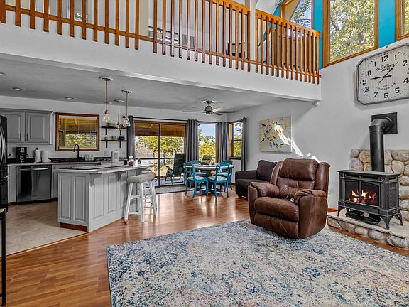 This 2-bedroom, 2-bathroom cabin offers breathtaking views of Table Rock Lake from every angle! Step inside to an open floor plan featuring soaring 2-story ceilings, large windows, and a cozy fireplace in the living room. The kitchen boasts stainless steel appliances and a convenient bar for seating, flowing seamlessly into the dining area, which offers direct access to the back patio and stunning lake views.The main floor includes a spacious bedroom with patio access and a full bathroom. Upstairs, enjoy a versatile loft space, a second bedroom with vaulted ceilings and large windows, a full bathroom, and a private deck overlooking the lake.Outside, the half-acre lot features a detached garage with two parking spaces and plenty of storage for all your lake gear. Just a 2-minute drive to Eagle Rock Marina, this is the perfect lakeside retreat!