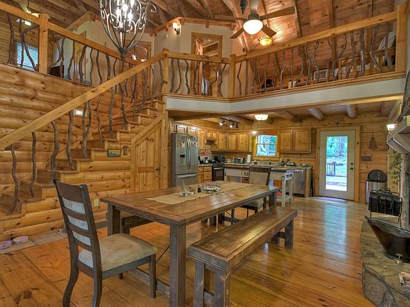Beautiful Log home W/ DEEDED Toccoa River access! Granite counter tops, Island and a Large dining room with a wood burning fireplace in addition to the gas fireplace in the Large Great Room, French doors to the screened in porch . Master/ bath and laundry on main floor, Upstairs bedroom and large sleeping loft, and bath. LOWER walk out basement fully finished with a Family room, bedroom and bar/kitchen and Huge storage area, screened in porch and parking area off the lower level as well! would make a great in law suite ! All paved roads to this private home on over 2 acres! Cabin sits above community lake path down the woods., TOO MUCH TO LIST