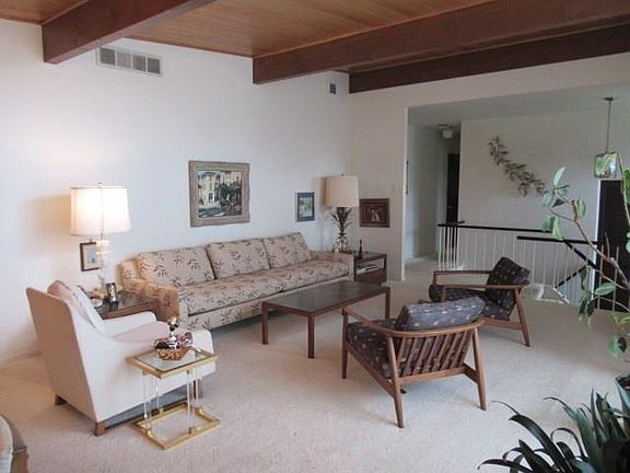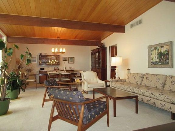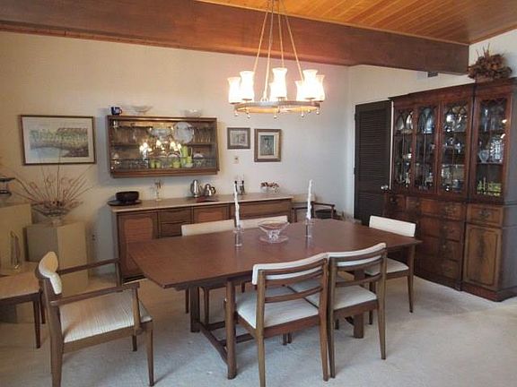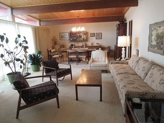 Well maintained 4 bedroom contemporary with spacious rooms and a very unique and open floor plan, living room and dining room with wood beamed ceilings plus large windows, Retro kitchen features newer cooktop, double ovens and granite counter tops open to family room area with corner log burning fireplace, laundry off kitchen, custom window blinds in family room and master, Master features walk in closet and full bath access. pocket doors through out lend itself to privacy. Large paneled game room along with private den space on lower level. Oversized two car garage could fit up to 4 cars. Covered rear porch, updated furnace, central air and hot water tank, nicely landscaped rear yard, close proximity to high school, RT 51 and shopping.
