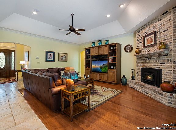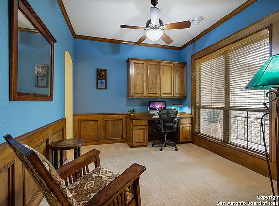 Private lot w over 2 acres of mature trees & a rain recovery system. 10' to 12' ft ceilings w crown molding expand the spaciousness of the open floorplan while an abundance of windows bring in the natural light & showcase all the special features. Wood & tile floors are in all the main living areas & built in cabinets are in both the study & family room. Gourmet kitchen has a wonderful bkfst bar, oversized island w wine storage & convection & conventional ovens. Wonderful flagstone patio w fireplace.