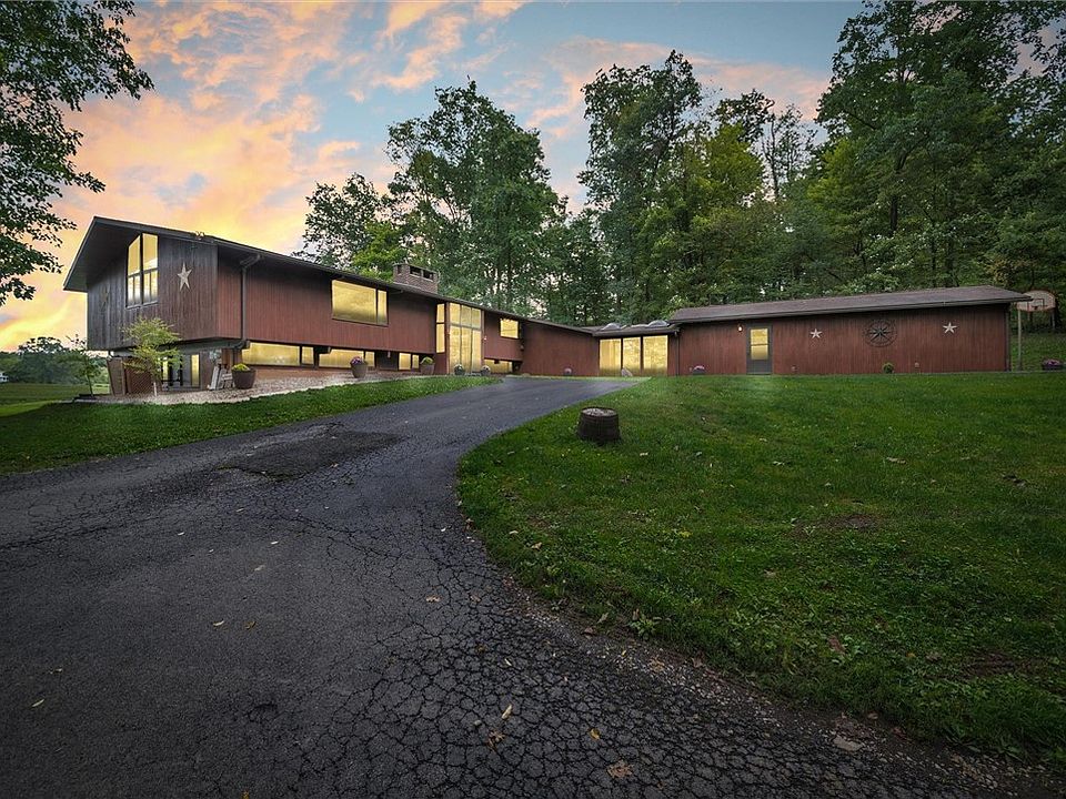 This amazing 4 bedroom, plus office, 2.5 bath Split Level home with cedar siding sits on 2.8 acres in a private wooded area. Open foyer welcomes you into beautiful Post & Beam architecture, 11' cathedral tongue & groove ceiling. Large windows bring in natural light. The spacious kitchen offers granite counters, butcher block island, abundance of cabinets. Brick fireplace with pellet stove for cozy winter nights. New engineered hardwood flooring. Large main floor master bedroom with en-suite & walk-in closet. Three more bedrooms share a full bath. An impressive office on the main floor can be used as a 5th bedroom. Finished basement with wet bar, hot tub room, another brick fireplace & pellet stove. Large deck overlooks yard & country views. Oversize mud room leads to garage plus workshop. Outside, you'll find a granite fire pit, play area, and trails through the woods. Central A/C, tankless hot water, huge laundry room, too many features to list. This spectacular home won't last long!