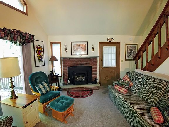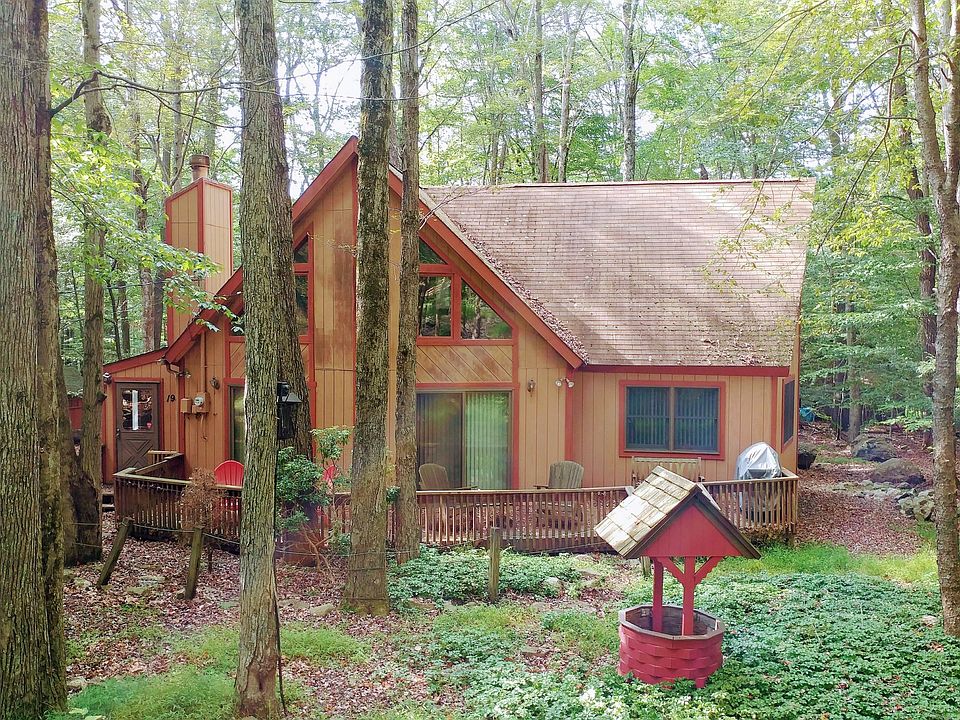 Plenty of room in this Pocono Chalet with over 2000 square foot of living space. There are Two living areas and 4 nice size bedrooms. Two baths and a large screened porch to enjoy on those cool Pocono Nights or just relax on the front deck. Living room has a stone Gas fireplace and family room has a gas style stove. This home is only a few minutes walk from Locust Lake Beach. The Shed is big enough for all your toys and a Quad which is permitted in Locust Lakes Village. THIS HOME COMES FURNISHED