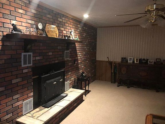 One level brick ranch with a carport, paved drive, beautiful level yard, two large storage buildings. Features 3 BR, 2 BA, Lg. den with wood burning stove insert, LR, kitchen/dining area and laundry room all on one level. Large covered front porch and back patio. Metal roof, and heat pump.
