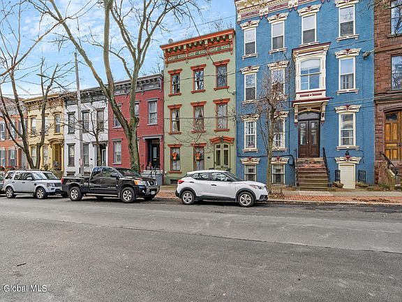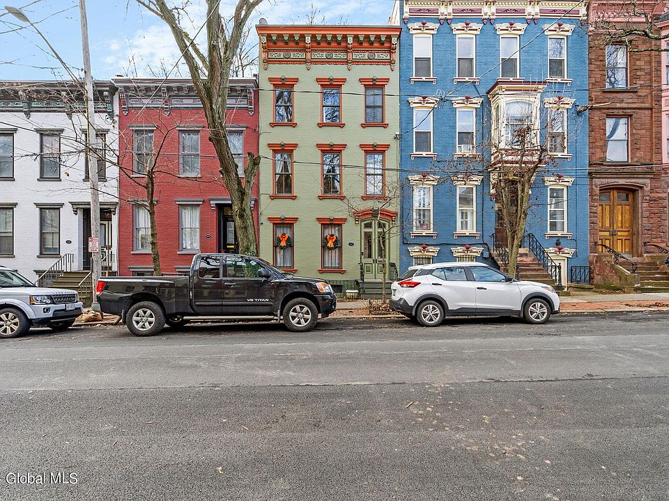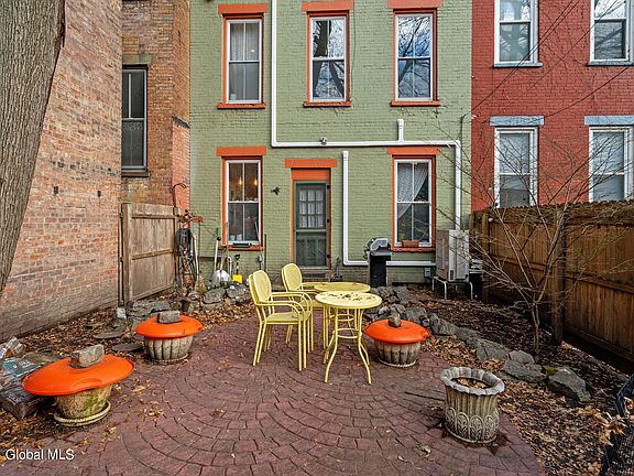 Step into timeless elegance with this charming Victorian townhome that seamlessly blends modern comforts and preserved historic details. Admire the craftsmanship of plaster moldings, pocket doors, marble mantels, vintage lighting, and wide plank flooring throughout. The updated cherry kitchen serves as the heart of the home, connecting effortlessly to a private landscaped garden with a welcoming patio, creating a perfect setting for indoor-outdoor living. Enjoy the convenience of ample closet space and a full dry basement, ideal for storage and equipped with laundry facilities. Lancaster offers easy access to downtown activities, lively Lark St, Washington Park, and nearby bus lines. Small wall-mounted cabinet in kitchen excluded.