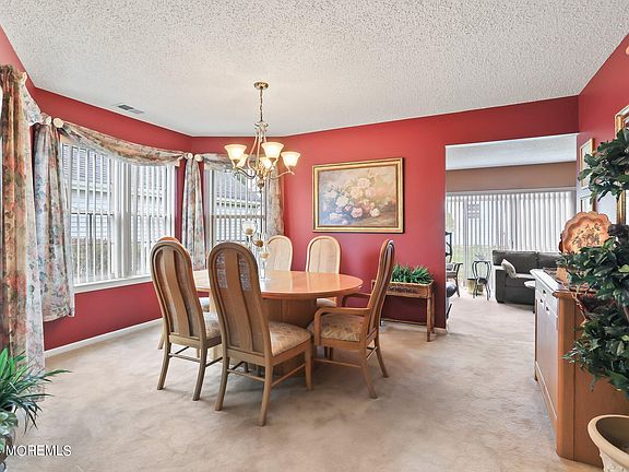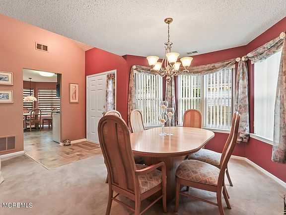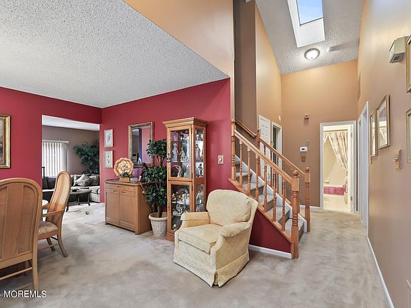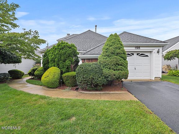 Located in the highly desirable gated community of Rain Tree in Freehold Township, this charming detached patio home is a true gem. The home welcomes you with beautifully manicured landscaping and a grand two-story foyer featuring a vaulted ceiling and skylight. The spacious eat-in kitchen boasts wood cabinetry, Corian counters, a tile backsplash, and a bay-windowed breakfast nook that bathes the space in natural light. Enjoy seamless indoor-outdoor living with sliders that open to a second patio. The step-down living room, complete with a wood-burning fireplace, also provides access to one of the spacious patios, perfect for relaxing or entertaining. The formal dining room, with its bay windowed area, offers plenty of sunlight, creating an inviting atmosphere for meals. The primary bedroom suite includes a walk-in closet, a full bath with a shower stall, and an oversized vanity. The second bedroom is conveniently adjacent to a full bath. Additionally, an 18x10 loft area is ideal for a home office or play area and includes an extra storage room. This home is equipped with newer HVAC, a hot water heater, and updated windows. The one-car direct entry garage adds convenience and ease. Residents of Rain Tree enjoy an exclusive country club atmosphere with amenities such as tennis courts, an outdoor pool, jogging paths, a 9-hole golf course, and much more. Commuter bus service to NYC is just minutes away, and the location is close to shopping and the Jersey Shore.