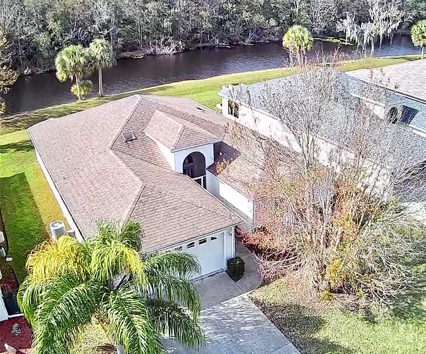 This waterfront paradise is sure to impress! With over 1600 square feet, this 2 bed, 2 bath, 2 car garage masterpiece also has a 3rd room for your office. Enjoy the gorgeous sunsets over the water while you relax with your fishing pole or kayak in the backyard. You could be living the dream, here in this secure and low maintenance community. The super low monthly fee covers lawn service, trimming of the home's bushes, cable TV, lawn irrigation maintenance, community pool maintenance, shuffleboard, and so much more. Also, enjoy the community restaurant and Executive style golf course about a half mile from the home. Only home owners get a key to access the pool. Also, the large family of neighborhood cranes is sure to entertain. It's birdwatching at it's best! At home, enjoy the large, open concept with vaulted ceilings and several skylights filling the home with natural light. As soon as you walk in the front door, you are drawn to the screened in patio displaying the sparkling canal in the backyard. The patio can be accessed by 3 different sets of sliding glass doors that still slide quite easily, one set in the living room, one set in the master bedroom, and another set in the dining room that's surrounded by 3 windows, displaying the amazing view! There are ceiling fans with lights in every large room. The master bathroom has double sinks, a walk-in shower with a built in tile bench, and a brand new toilet. The office has double doors and helps separate the master bedroom from the guest bedroom and bathroom, giving everyone their space and privacy. It's the perfect layout, in a perfect location, with a stunning waterfront view. The front door, sidewalk, driveway, entryway, back patio, windows, and all the exterior siding was just pressure washed on December 30, 2023. The hot water heater was recently installed in 2022. This is a great opportunity to live in a beautiful home on the water, with tons of benefits, for less than $239k! Since it's such a desirable location and lifestyle, this community is in high demand. There is a parking lot available for boat and trailer storage, near the boat ramp to the lake. This is a win-win situation, and it won't last long at this price, so call or text for a private showing before it's gone!
