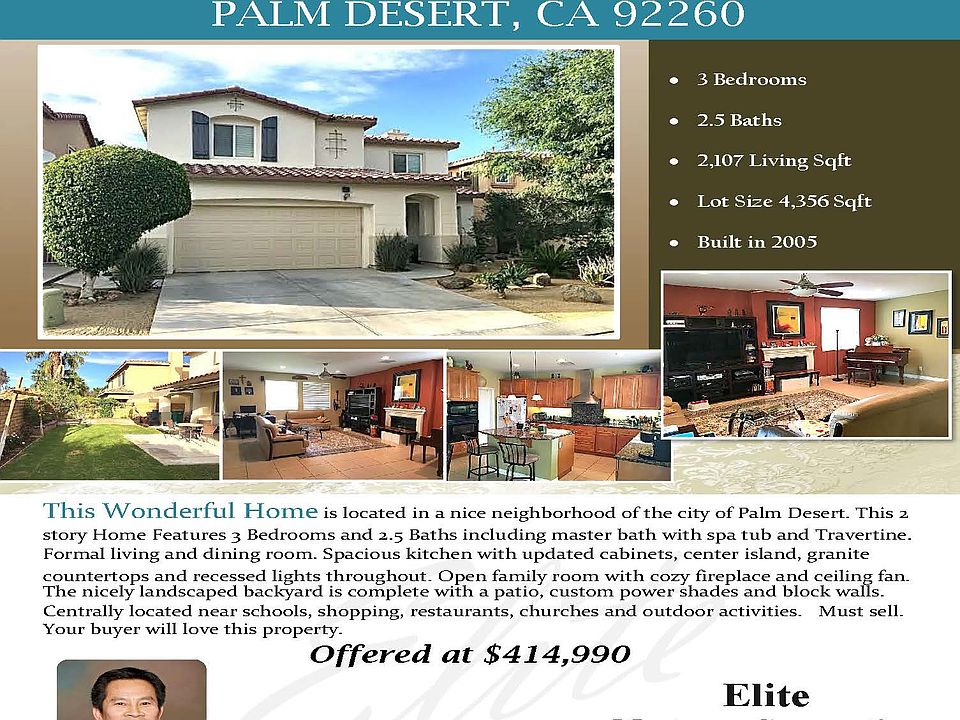 You will absolutely fall in love with this coziness, beauty and warmth of this incredible home to reside. A Perfect home For families situated in central Palm Desert, quiet gated community; minutes from El Paseo, Westfield Mall, the River; walking distance to Trader Joe’s, Whole Foods, Nordstrom Rack, and the famous Bump and Grind Trail… The property with an open floorplan in the highly desirable and sought after Palm Desert neighborhood, it's featuring 3 bedrooms with Travertine master bath, Jet tub / 2 bath on up stair level, seating a half bath on 1st floor. Custom family room with a granite fireplace perfect for entertaining. With upgraded kitchen that has solid wood cabinets, Granite countertops, stainless appliances with New range hood and faucet, custom built storage, and separate island breakfast bar perfect of. Ceiling fans in every room Cement walkway around the house with extended patio pad; Retractable awning in backyard. Blockwall/bullnose planters. Street is recently resealed. Good schools, community college, and world class restaurants. Must see to appreciate.
