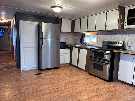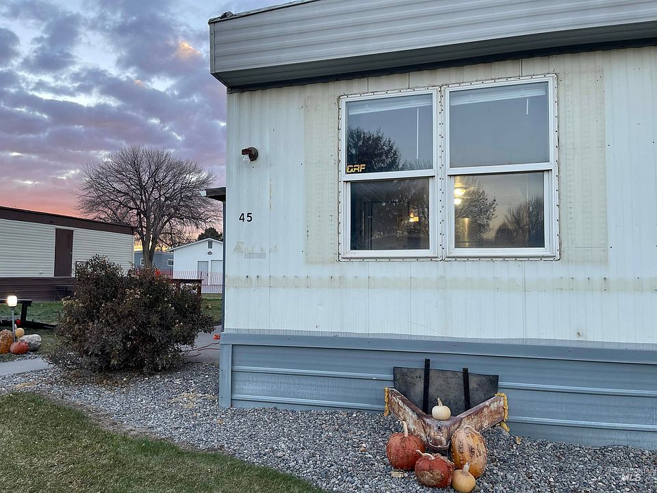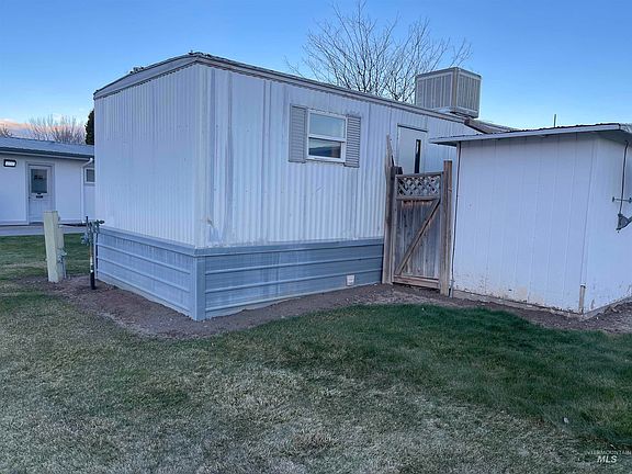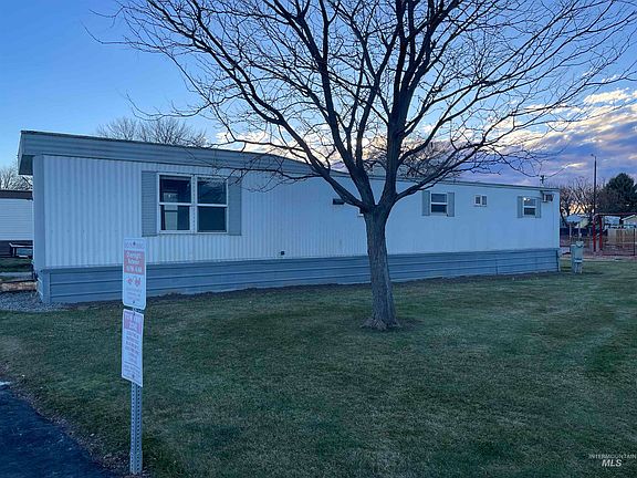 Surrounded by great green space this 2 bed, 1 bath singlewide South of Twin Falls has great proximity to manufacturing jobs. Good size living room and bedroom give the homeowner room for larger furniture. Some improvements have been made: water heater flushed and gas line run to edge of home. Metal (aluminum) roof for longevity. Affordable living in a great park for just $455/mo lot rent. The new owner must be approved to join the mobile home community with accepted offer and prior to closing. Reach out to a real estate agent to tour today! With 1/2 down owner may be willing to consider owner-carry option.