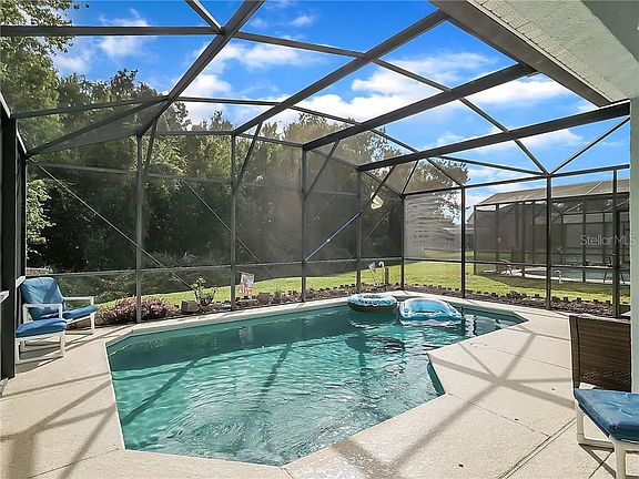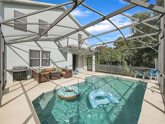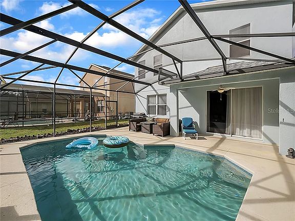 Beautiful move in ready. Heated pool home, with no rear neighbor in a cul-de-sac Located in Davenport, This beautiful 4 beds/3.5 bath. Boasts Two master suites. Is an ideal investment for vacation or rental. A beautiful conservation area to the right and back of the home. Sit pool side and enjoy your morning coffee. Inside, has vaulted ceilings with an open floor plan, laminate flooring, newer appliances. Roof is only three years old. Sandy Ridge is close to I4, Disney & Universal Studios.