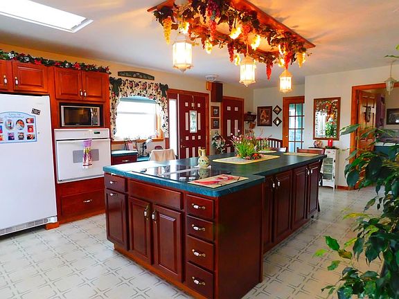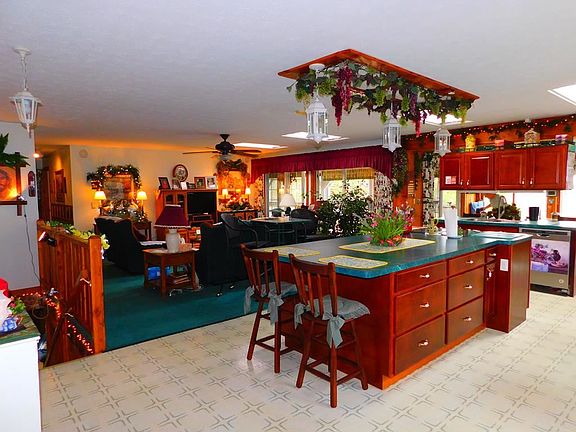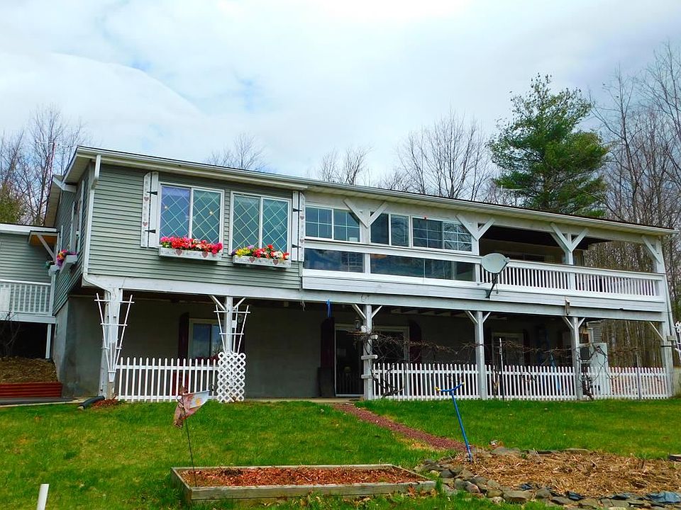 A private retreat w/acreage, a barn, a pond & a view! Open kit w/cherry cabinets & huge island. Engineered Hardwood recently added to living room and large master suite w/a walk in & sliding glass door to covered deck. 2 more BRs, full bath & laundry rm complete the 1st flr. Downstairs another huge great rm & full kit. 2 more good sized BRs w/more storage space & full bath. Variety of hardwoods on property: oaks, maple, beachwood & ash (has not been logged in over 20 yrs). 40x72 barn and huge space for a garden. Blue Max Foundation walls. Enclosed Porch. 2 car garage attached.