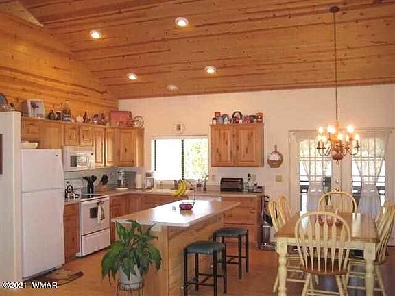Beautiful log sided cabin in the woods. Open floor plan layout with knotty pine vaulted ceiling, laminate flooring, 3 skylights, a spacious loft for extra bedroom potential and central heat and A/C. Cozy fireplace in the living room, kitchen island and all appliances are included. There are security screen doors and security cameras. Covered front and back composite decking with a hot tub, and a spacious open patio with a gas fire pit for enhancing outdoor entertaining. The meticulously landscaped lot has a sprinkler system, huge blue spruces adorning the property and the rear yard is completely chain link fenced. The 2 car garage includes custom cabinetry and a built in workbench. Furnishings are negotiable. Come and see the pride of ownership demonstrated here.