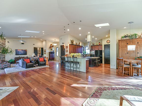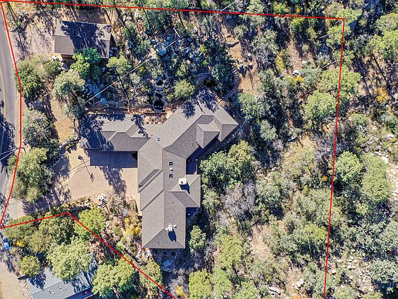 Private in-town estate with guest house, bonus room (studio, office, extra guest space) and 22 x 40 RV garage on an acre in the tall pines of Prescott. No HOA! One level with open concept living featuring living area with rock-faced fireplace and rich cherry floors, high-end appliances, cabinetry and granite counters, huge walk-in pantry, formal dining area with dramatic chandelier and built-in cherry cabinets, casual dining area opening to patio with waterfall. Sumptuous owner’s suite with sitting room or office, massive closet with built-in cabinetry, dreamy spa bath. Two guest bedrooms and 3/4 bath. Mud room leads to 4-car attached garage with dog wash. RV garage has 220 volt, 30 amp service and an electric space heater. Guest house has living room, bedroom area with two-sided fireplace, full kitchen and bath with walk-in tub. Double-pane low-e windows throughout 4-car, oversized garage with 2-openers No steps, except to lower level bonus room Central vacuum, including garage Whole house wired for cable, internet, DirectTV with 2 dishes Power skylights with remote control opening, auto-closing in event of rain Sunsetter retractable awnings and shades on house and guest house Recirculating hot water pump Reverse osmosis drinking water system Breakfast room, formal dining room with natural cherry built-ins 8-ft alder doors throughout Huge master closet with 4 walls of built-ins plus center island Wired (220V) for hot tub behind master bedroom Gorgeous kitchen with grade 5 granite, cherry-stained cabinetry, built-in Dacor coffee center, Jenn-Air appliances, Zephyr range hood and large walk-in pantry All drawers in home are full extension with quiet-close cabinetry Brazilian cherry hardwood floors High-end fixtures throughout, including Toto toilets and agate sinks Custom large dog door and dog shower Laundry room with travertine floor and granite counters Granite counters in 4 of 5 bathrooms Master bath with Bain Ultra jetted tub, Toto bidet, two-headed walk in shower with river rock floor and remote-control pleated shade Wrap-around Trex deck with partial covering, ceiling fans, and dual-fuel fireplace, overlooks seasonal creek Breakfast patio overlooking waterfall and fish pond Private upper sitting area Fenced yard Home office with mahogany built-ins Dual-Zone HVAC with split system A/C and heat in bonus-room Formal living room with dual-fuel fireplace Master BR and office in one wing, 2 bedrooms and baths with travertine floors, granite counters, vessel sink Whole house security system Attached guest house w/ full kitchen, laundry, FP, walk in closet, separate front door entry and back deck access, remote control pleated shades, completely ADA compliant Undercounter lighting in kitchens, laundry Bonus-room on lower level could be art studio, workout area, teen or in-law suite, game-room plumbed and wired for efficiency kitchen 22’ x 40’ RV garage with skylights, electric heat, and 30 amp electrical outlet Extensive landscaping with flagstone, concrete paver driveway, low-e LED landscape lighting, sprinkler/drip system, low-water use plants Class 1a fire rating, with Hardiplank siding and 30-year architectural shingles